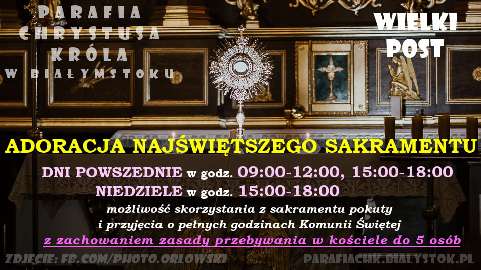 Natomiast w kościele, w dni powszednie od 9.00-12.00 i 15.00-18.00 a w niedziele od 15.00-18.00 będzie adoracja Najświętszego Sakramentu z możliwością spowiedzi i przyjęcia o pełnych godzinach Komunii Świętej z zachowaniem zasady przebywania w kościele do 5 osób.