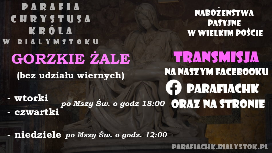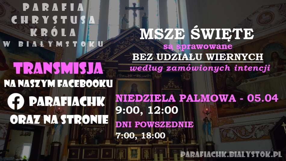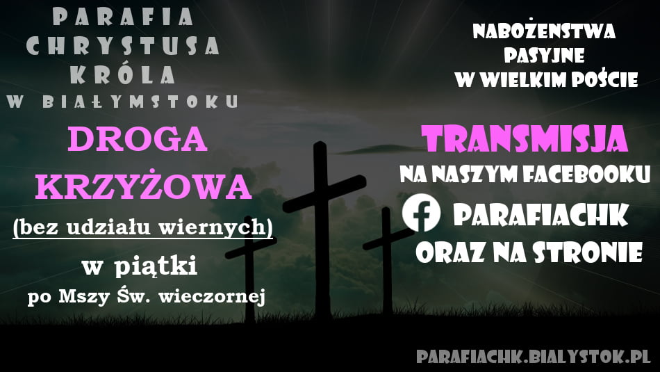 Do ich odwołania Msze św. w niedziele i dni powszednie, Gorzkie Żale i Droga Krzyżowa będą sprawowane bez udziału wiernych, w kaplicy naszego Domu Parafialnego. Będziemy je transmitować przez Internet (Facebook: parafiachk). Będą one odprawiane według zamówionych intencji.